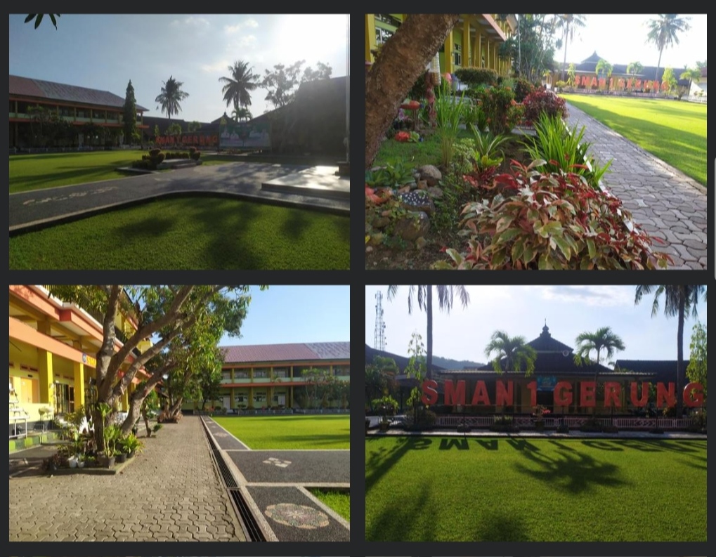 Lapangan hijau yg tampak selayaknya lapangan sepak bola dan tulisan spot photo SMAN 1 GERUNG menjadi item indahnya sekolah ini. Bunga-bunga yg indah tumbuh dengan asri sehingga tidak sedikit orang yg berkunjung disekolah merasa seakan-akan berada di area villa atau sejenisnya.